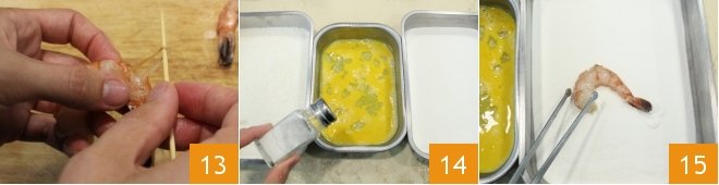 Eliminate the intestine with the help of a toothpick or the tip of a small knife 13. Then equip yourself with 3 trays: in the first pour rice flour, in the second break and beat the eggs and in the third place coconut flour. Once beaten, salt the eggs to taste 14 and dip each shrimp in rice flour 15.