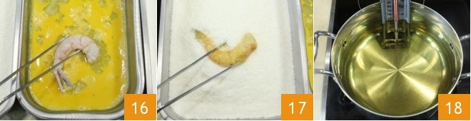Dip the shrimps in the beaten egg 16 and finally in the coconut flour 17. Pour the seed oil in a high-sided pan and cook until it reaches a temperature of 340-350°F (170-180°C) (check with a kitchen thermometer) 18 .