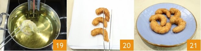 Dip the shrimps in the boiling oil and let them fry for 1 minute 19. Always fry a few at a time, so that the oil maintains the right temperature. When they turn golden brown, take the prawns out and drain on a tray covered with absorbent paper 20. Transfer the coconut shrimps to a dish 21. Your coconut shrimps are ready to be served hot, accompanied by the delicious sauces!