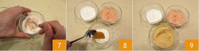 stirring with a teaspoon in order to mix everything well 7. Let's prepare the second sauce, adding red Thai curry 8 to the last bowl and mix everything: your 3 sauces are ready 9.