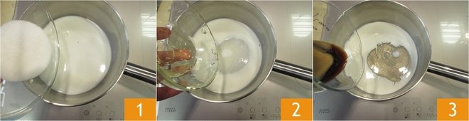 To prepare coffee ice cream, first make the coffee. At this point, pour the milk into a saucepan, add the sugar 1, the glucose syrup 2, and the freshly made coffee 3.