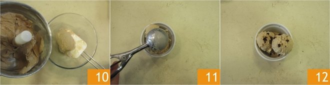 Transfer the ice cream to a baking dish 10, cover with plastic wrap, and place in the freezer for about 2 hours; this way, it will be more compact but still creamy. However, if you prefer, you can skip this step and consume it immediately. After two hours, take the ice cream out of the freezer and use an ice cream scoop to transfer it to cups 11. Decorate with chocolate shavings and serve immediately 12.