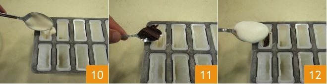 Equip yourself with a mold for popsicles and insert a little coffee cream inside each section 10; then add the chocolate chips 11 and continue adding a little white cream 12.
