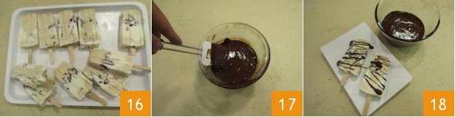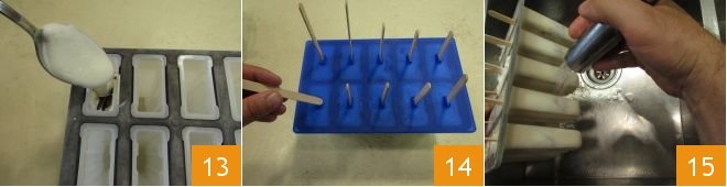 Continue alternating the two types of cream 13 until the mold is completely filled. Insert the wooden sticks 14 and place in the freezer for at least 4 hours. After this time, take the mold of the freezer again, wetting the outside of the mold 15