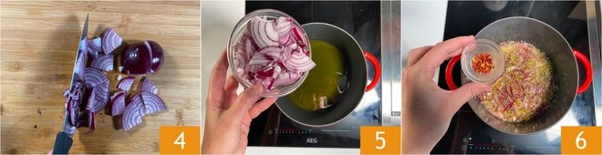 Cut in half again to get quarters, then cut it into slices around ? inch (3-4 mm) thick 4. Heat the oil in a thick-bottomed pot or saucepan and then add the onion 5. It’s a good idea to use one that’s cast-iron and not too wide, if you have one, that way the onion will be nearly fully covered by the oil. Let the onion fry over medium heat for around 10 minutes, then add the chili 6.