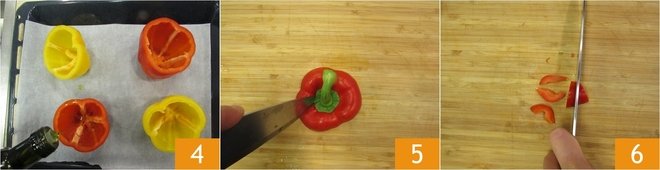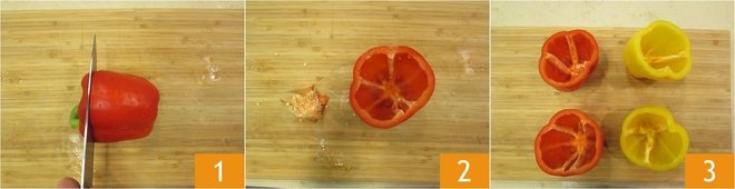 To prepare couscous stuffed peppers, start by washing and tipping the peppers 1. Leave the cap to one side, you'll need it later on. Now remove the seeds inside with a knife 2, without breaking up the pepper. Do the same for all the other peppers 3.