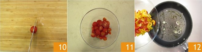 Thoroughly wash the tomatoes and cut them in half 10 11. Now pour 3 spoon of oil in a pan and add the shallot. Lightly bronw, then add the peppers 12.