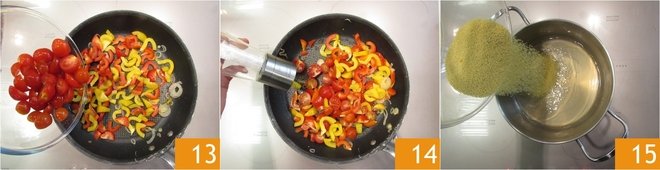 add the tomatoes too 13 and flavor with salt 14. Cook on a medium flame for around 15 minutes, turn over occasionally. Heat the vegetable squash in the meantime, which should be the same weight as the couscous. As soon as it starts to boil, add the couscous 15.