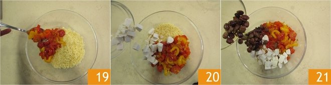 Place in a bowl, crumble with a fork and add the vegetables 19, the diced feta 20 and the pitted taggiasca olives, drained from the preservation oil 21.