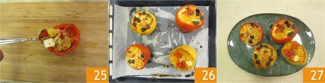 Fill them with the couscous, be sure to pack it down 25 and place once more on the tray. Add a drizzle of oil and bake in a static oven preheated to 355°F (180°C) for a further 25 minutes. Remove from the oven 26 and serve 27.