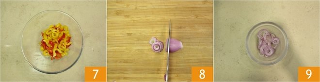 Place in a bowl 7 and leave to one side. Now peel and slice the shallot 8. Place it in another bowl 9 and leave to one side.