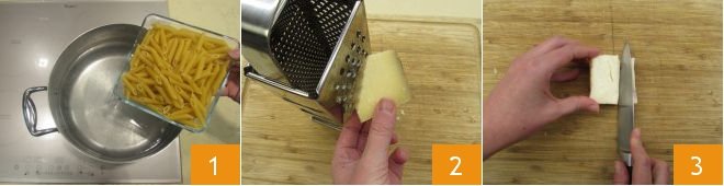 To make the four cheese pasta, start by immediately plunging the penne rigate into a pot of salted boiling water 1. While the pasta is cooking, prepare the cheeses: grate the Gruyère using a coarse grater 2, then cut the taleggio into small cubes 3.