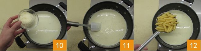 At this point, turn off the heat and add the grated Parmigiano Reggiano 10, then season with white pepper. Mix well to combine everything 11. When there is one minute left of the pasta cooking time, transfer it directly to the cheese sauce using a slotted spoon 12.
