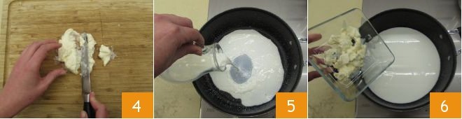 Finally, remove the rind from the gorgonzola and cut it into pieces 4. Move to the stove: pour the milk into a saucepan 5 and heat it over low heat until it almost boils, then add the gorgonzola 6.