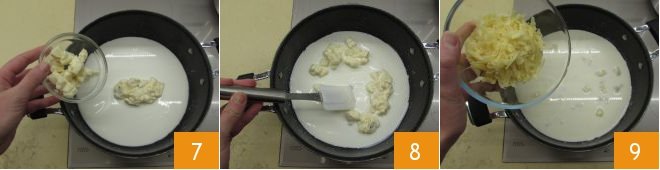 Add the taleggio as well 7 and stir gently to help it melt 8. Finally, add the Gruyère 9.