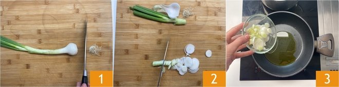 To prepare the creamy pasta and peas, start by putting a pot full of salted water on the stove, which will be used for cooking the pasta. Then move on to the scallion: remove the lower part with the roots 1 and the green part. Remove the outer layer and slice it into rings 2. In a saucepan, pour a bit of oil and add the scallion 3.