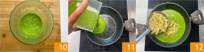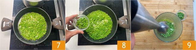 Let it cook for about 10 minutes 7. After this time, cook the fusilli in the water, which will now have reached a boil. Set aside some peas for the final plating and transfer the rest to a tall, narrow container. Blend the peas with an immersion blender 9.