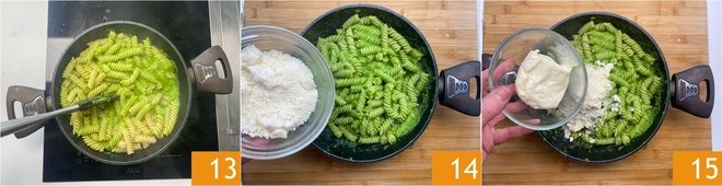 Mix well 13, adding a bit of cooking water if necessary. Off the heat, stir in the grated Grana Padano 14 and the Stracchino cheese, keeping some aside for the final decoration 15.