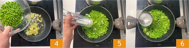 Add the peas 4, salt 5, and a couple of ladles of the water set for cooking the pasta 6.