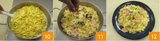 At this stage, the water should be boiling, so salt it and cook the tagliatelle for the time indicated on the package 7. Meanwhile, pour the cream into the pan with the salmon, keeping the heat off 8. When the tagliatelle is cooked, drain it and transfer it directly into the pan 9.