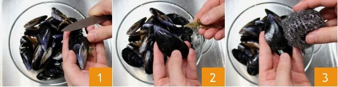 To prepare crostini with mussels and cherry tomatoes, start by cleaning the mussels. Place them to a large bowl and, after washing them carefully under running water, use the back of a knife blade to remove all scale and barnacles 1. Scrub mussels individually to remove the beard from the valves 2. Under fresh running water, rub the mussels vigorously using a steel wool pad or a stiff brush 3.