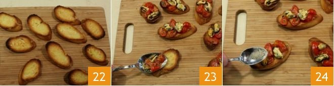 Toast the crostini in a static oven preheated to 360° F (180° C) for 5 minutes, or in grill mode for 2 minutes: in either case, turn each slice over about halfway through. When the crostini are ready, place them on a chopping board 22 and, with the help of a spoon, garnish each one with some tomatoes and 2 mussels 23. Finish with a sprinkling of salt and pepper 24. Your crostini (toasted bread) with mussels and cherry tomatoes are ready!
