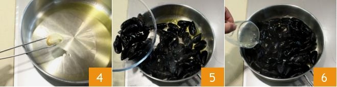 Brown some of the olive oil in a non-stick pan with the unpeeled garlic clove, which you can remove when it turns golden brown 4. Pour the cleaned mussels 5 into the oil and immediately add the white wine 6.