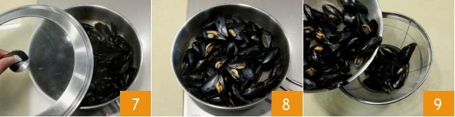 Place a lid on the saucepan 7 and let it cook on high heat for 5 minutes, which is the time needed for the mussels to open. When they are ready 8, pour the mussels in a strainer, taking care to place a bowl underneath to collect the cooking liquid 9.