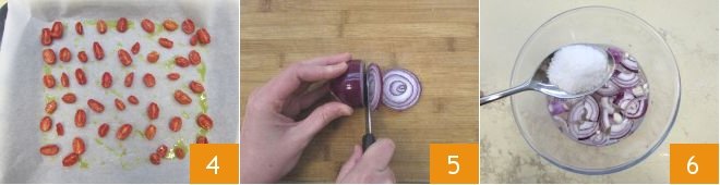 Cook the tomatoes in a preheated fan oven at 210°F for 1.5 hours, keeping the oven door slightly open (alternatively, you can use a preheated static oven at 250°F for about two hours) 4. In the meantime, handle the onion: slice it into thick slices, about 1/8 inch 5, and then cut each slice into 4 wedges. Place the sliced onion in a bowl full of cold water, covering it with 2 tablespoons of coarse salt 6. Let them soak for about 1 hour, changing the water and salt after half an hour: this treatment will make them more digestible.