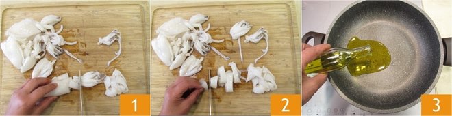To prepare cuttlefish with peas and bacon, How to clean cuttlefish, separate the tentacles 1 and cut them into pieces 2. Pour the oil into a pan 3.