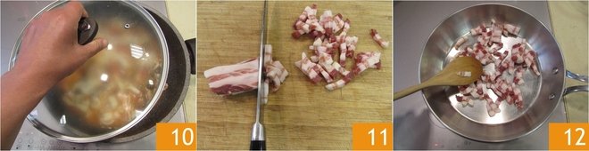 Cover with a lid 10 and lower the heat, cooking for about 30 minutes. Slice the pancetta into strips 11 and brown it in a slightly heated pan 12.