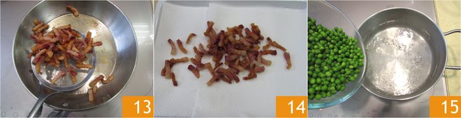 When it is golden and crispy, drain it from the fat released during cooking with a slotted spoon 13, place it on a kitchen towel 14, while keeping the fat aside. Cook the peas for 5 minutes in plenty of lightly salted water 15.