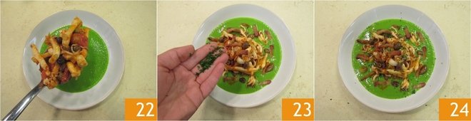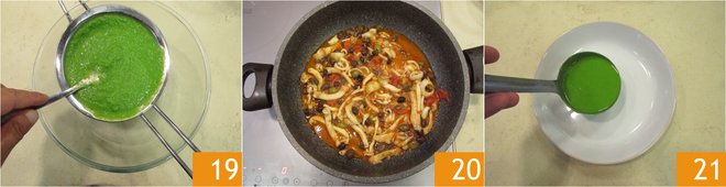 Strain the puree through a sieve to make the cream smoother 19. Once the cuttlefish is ready 20, you can plate with the pea puree as the base in the center 21.