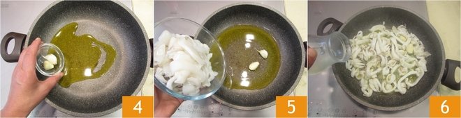 Add two garlic cloves 4, let the oil flavor, and then add the cuttlefish 5. Brown for 2-3 minutes. Deglaze with the white wine 6 and let the alcohol evaporate completely.