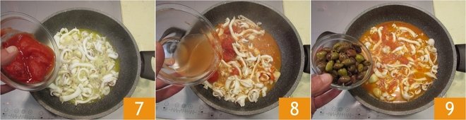 Slightly crush the peeled tomatoes with your hands. Add them to the pan with the cuttlefish 7 along with a ladle of hot water 8 and the Taggiasca olives 9. Salt and pepper.