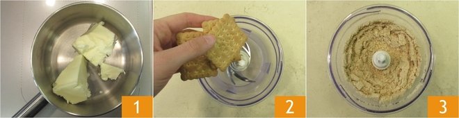 To make the delicious strawberry cheesecake, first prepare the base: melt the butter in a saucepan 1 and let it cool slightly, meanwhile pour the biscuits into a mixer 2 and blend to reduce them to crumbs 3.