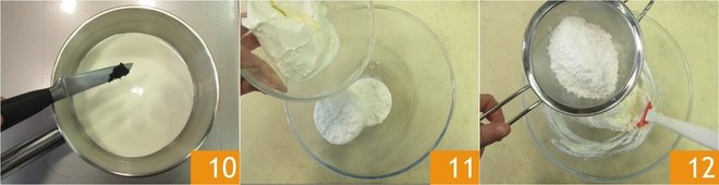 Pour the cream and the seeds of the vanilla pod into a saucepan 10, turn on the low heat and bring to a simmer. Meanwhile, mix the ricotta and mascarpone in a bowl with a spatula to get a smooth and homogeneous cream 11, then add the sifted powdered sugar 12.