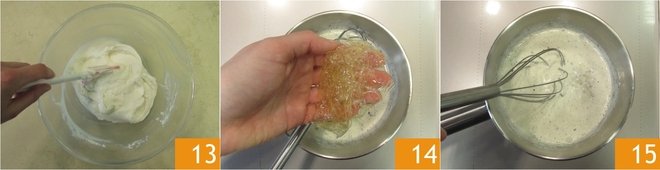 Mix again to combine 13. Squeeze the gelatin and add it to the hot cream 14, turn off the heat and stir with a whisk to dissolve it evenly 15.