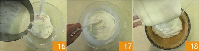 Pour the cream and gelatin mixture into the bowl with the ricotta and mascarpone cream 16 and mix again 17. At this point, take the base and pour the cream inside 18.