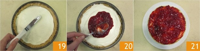 Level the surface with a spatula 19 and let it set in the refrigerator for an hour. After this time, spread the strawberry jam over the cream 20 and put your delicious strawberry cheesecake back in the refrigerator until ready to serve 21!