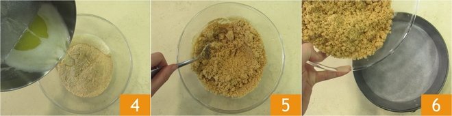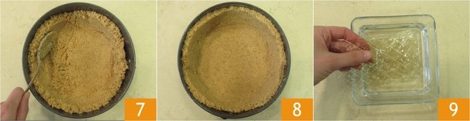 Press down with the back of a spoon to compact the base well 7, then place in the refrigerator for about 15 minutes while you prepare the cream 8. Soak the gelatin in cold water 9.