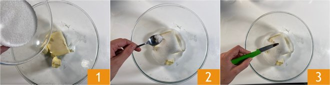 To make the desert rose cookies, put the room-temperature (so fairly malleable) butter in a bowl along with the sugar 1, salt 2, and vanilla extract 3, and stir with a spatula until you get a creamy mixture.