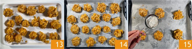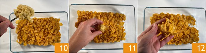 Take a spoonful of dough 10 and dredge in whole cornflakes 11, turning the dough so that it’s covered, and compacting it slightly 12.