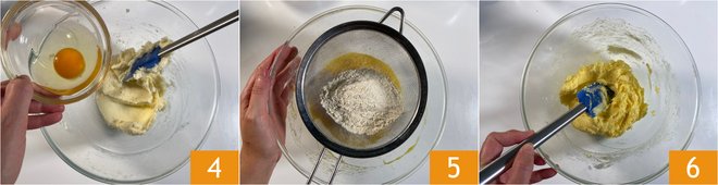 Add the eggs one by one (4(. Sift the flour 5, then add this to the bowl and stir to combine 6.