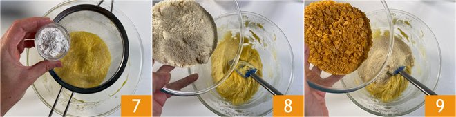 Next, sift the baking powder into the bowl 7, followed by the almond flour 8 and crumbled cornflakes 9. Stir again to combine.