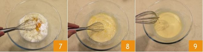 Once you have added all the ingredients to the bowl, start whisking with a whisk, first slowly 7, then vigorously 8 until the mixture is smooth and lump-free 9.