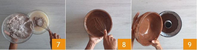 Little by little, add the mix to the liquids and gently incorporate with the whisk 7. You will get a smooth and lump-free mixture 8. Pour the mixture into a 9 1/2-inch pan (measured on the surface) with a 8-inch base and a height of 4 inches, greased and floured 9.
