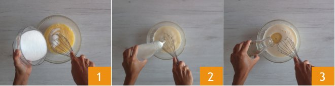 To prepare the easy cocoa bundt cake, start by breaking the eggs into a bowl and start to lightly beat them with a hand whisk while pouring the sugar 1. Whip for a couple of minutes before pouring and mixing the milk 2 and the oil 3.