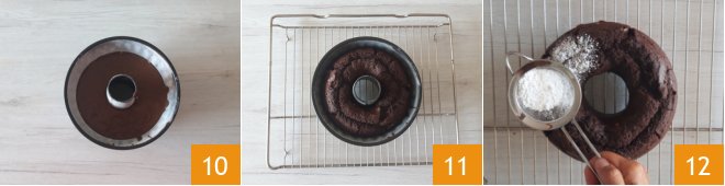 Level 10 and bake at 355°F, already hot in static mode, for about 40 minutes 11. Always do the toothpick test before taking out of the oven. Let cool and gently unmold the cocoa bundt cake. Dust with powdered sugar when it's cold 12.