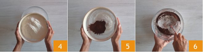 In another bowl, sift the flour and baking powder 4, do the same with the cocoa 5. Mix with a spoon to blend the powders 6.